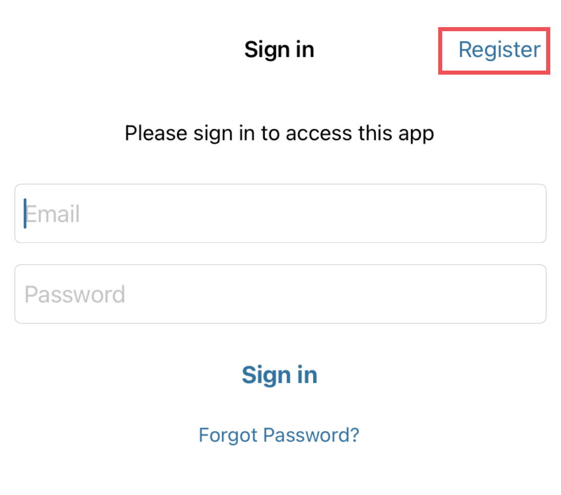 - Launch the app and tap “Register” in the upper right corner of the app screen
